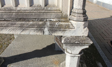 La colonna anteriore destra risultava spostata, compromettendo anche l’ancoraggio in ferro, ormai infranto. Il basamento mostrava distacchi tra sarcofago e pilastri, compromettendo la stabilità generale dell’opera.